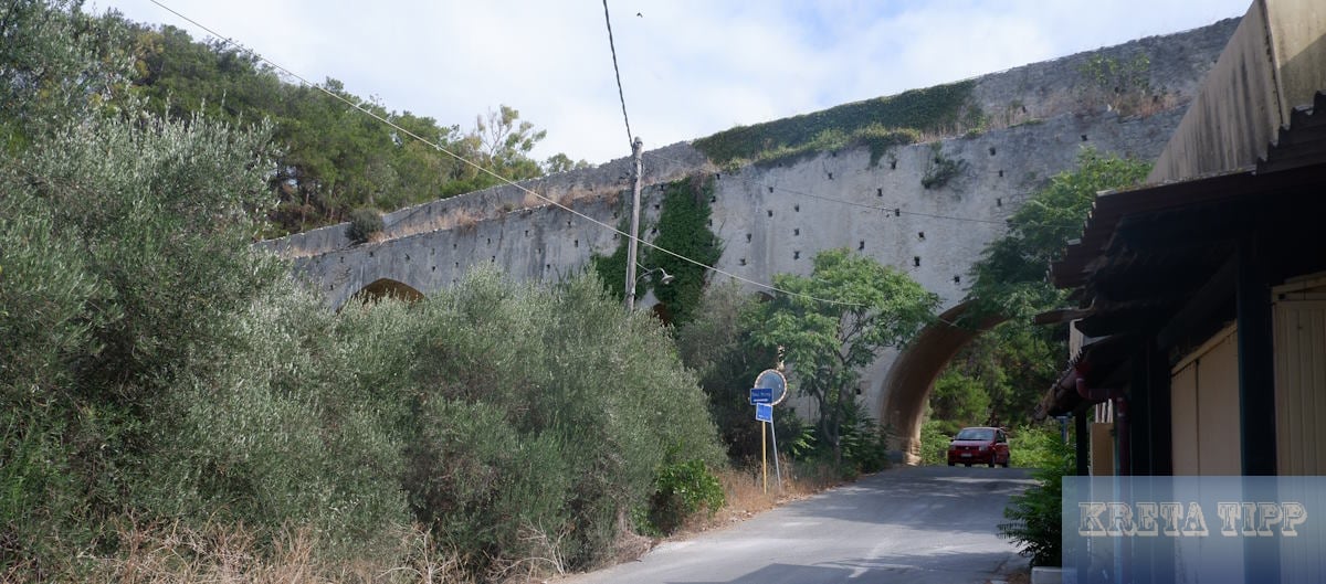 Das Aquädukt hat eine mittelalterliche oder sogar antike Erscheinung, ist aber in Wirklichkeit keine zwei Jahrhunderte alt. Es wurde in der kurzen Zeit der ägyptischen Verwaltung von Kreta in den Jahren 1832 bis 1840 errichtet.