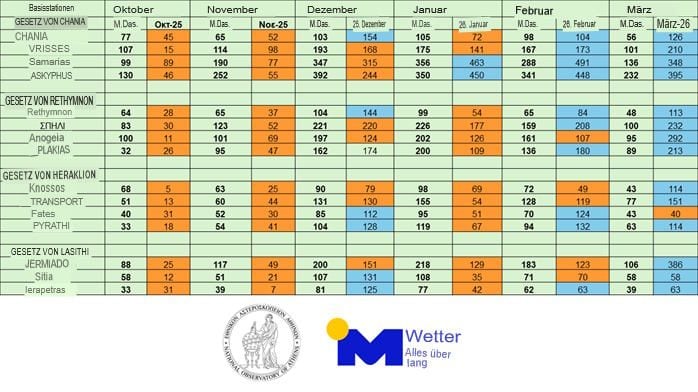 * Oktober & November 2025: Die Niederschlagsmengen waren in allen vier Regionalbezirken Kretas (Chania, Rethymno, Heraklion und Lasithi) äußerst gering.