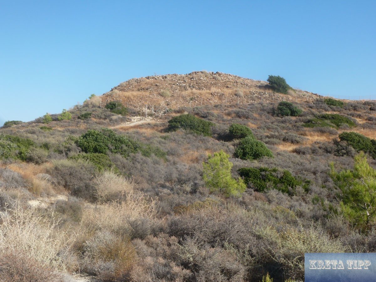 Lage: Die Stätte befindet sich auf der Spitze und den oberen Hängen eines steilen Hügels mit Blick auf das Libysche Meer, in der Nähe des modernen Dorfes Myrtos.
