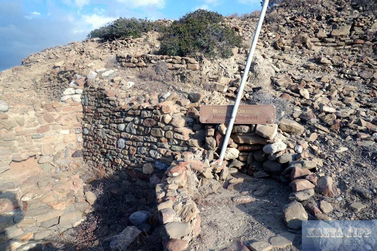 Architektur: Die Siedlung besteht aus einem Komplex aus kleinen Räumen und engen Gängen, der typisch für die frühminoische Architektur ist. Diese Strukturen wurden dicht beieinander gebaut, wodurch eine dichte, stadtähnliche Umgebung entstand.