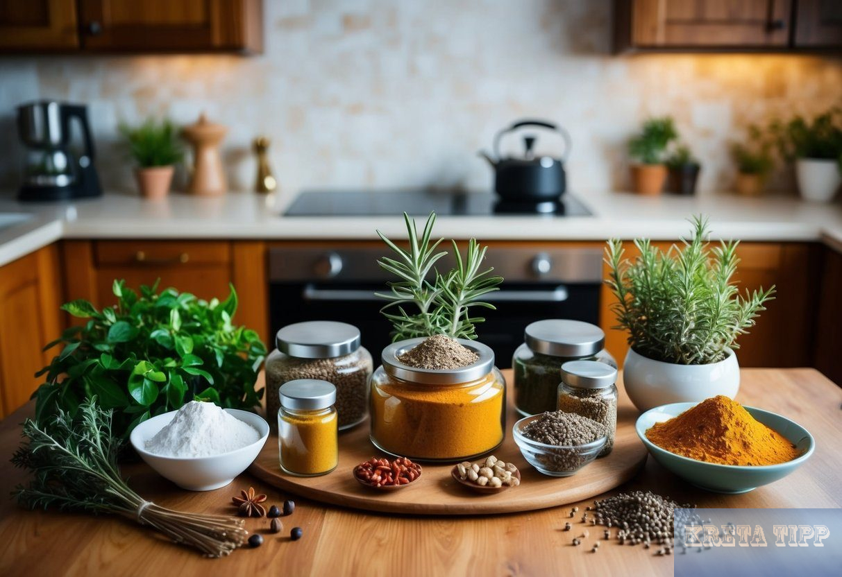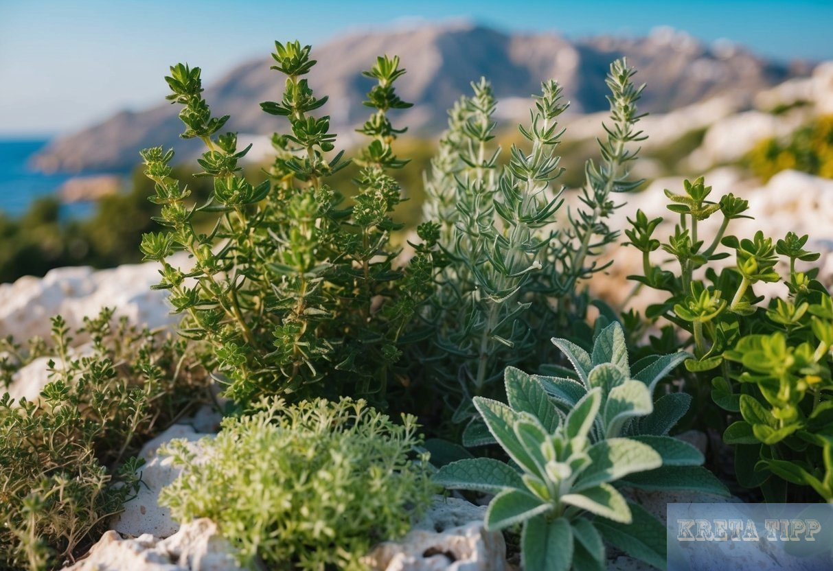 Zu den kretischen Gewürzen gehören Oregano, Thymian, Rosmarin und Salbei. Diese werden in der Küche häufig verwendet.
