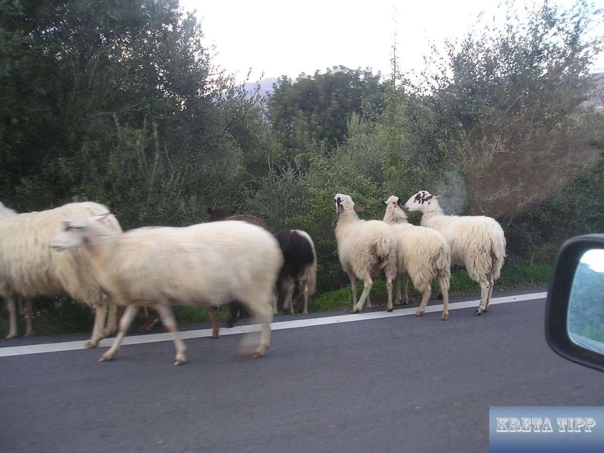 Ein häufiger Anblick hier: Straßenhindernis durch Schafe auf dem Rückweg vom Lasithi-Plateau.