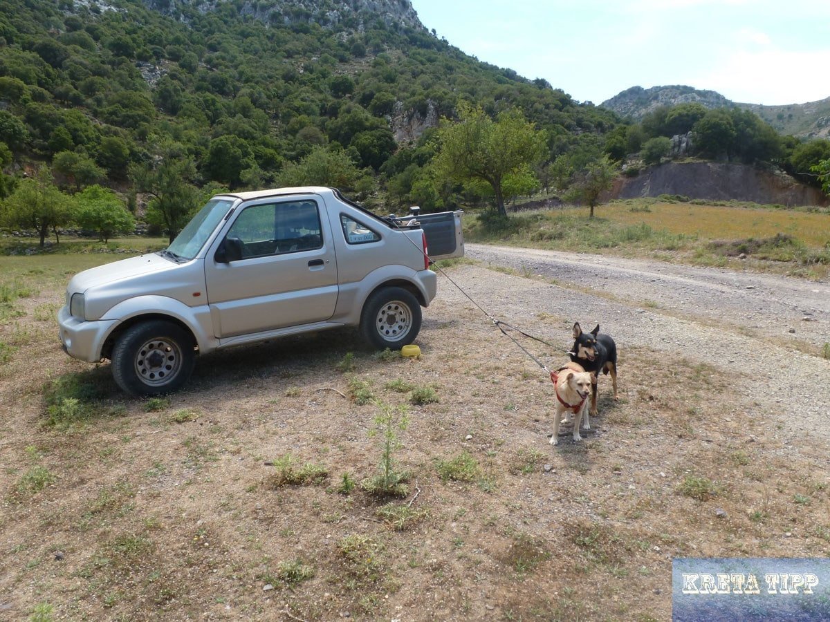 Durch die Lassithi-Hochebene verläuft ein Netzwerk von Wanderwegen, welches unser Interesse erweckte, sodass ich mich mit meinen Rescue-Hunden zu einem ersten Erkundungstrip im nordwestlichen Teil des Plateaus aufmachte. Ausgangspunkt war der Nordwesten der Ringstraße, wo zwischen der Ortschaft Kato Metochi und dem Kloster Vidani eine unbefestigte Straße nach Westen abzweigt – direkt an der Stelle, wo sich das Hinweisschild für das Kloster befindet.