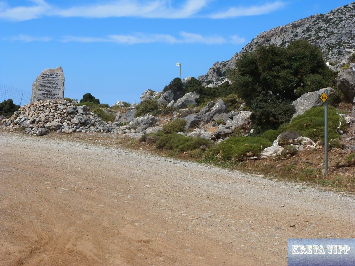 Nach einem Stück auf der Straße trifft man auf einen großen und von weitem sichtbaren Gedenkstein, welcher daran erinnert, dass vor über 200 Jahren an dieser Stelle der ‚türkische Bandit Tsoulis Pascha von Anwohnern wegen seiner Verbrechen gegen Christen hingerichtet‘ wurde. Auch weist der Stein darauf hin, dass der Pfad schon zu Zeiten der Minoer benutzt wurde. Aber auf jeden Fall geht seine Benutzung bis in die venezianische Zeit zurück.