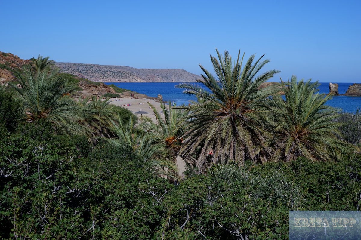 Die plötzliche Erscheinung von Europas einzigem Wildpalmwald ist tatsächlich ein überragender Anblick. Die Palmen sind die lokale Art Phoenix theophrasti (Kretische Dattelpalme) und sind schon auf Kreta seit Jahrtausenden heimisch. Ihre Früchte sind ungenießbar, wie bei allen Palmen im nördlichsten Verbreitungsgebiet des Mittelmeerraumes.